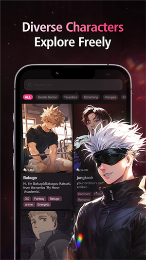 涵盖多种角色类型,包括治愈系、恋爱向、二次元等风格,还有动漫热门角色(如五条悟、爆豪胜己等),角色按热度榜、新进榜、趋势榜分类展示,用户可直观了解不同角色的受欢迎程度,快速找到心仪对象。