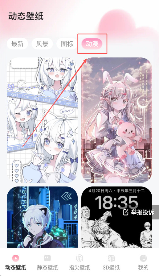 1、打开心动桌面壁纸点击动态壁纸的动漫分类浏览壁纸,进入动态壁纸的动漫分类页面浏览各种主题壁纸资源。