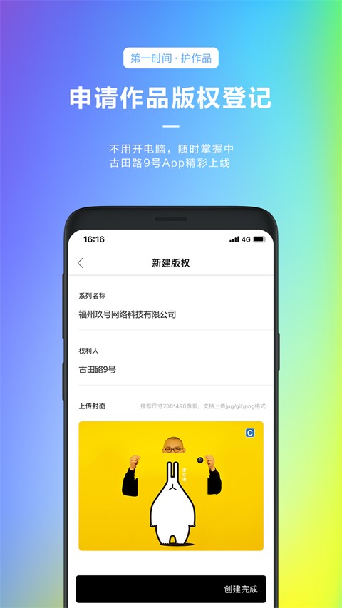 1、古田路9号已实现原创作品版权登记、创意作品分享、资讯征集活动发布、人才库招聘;