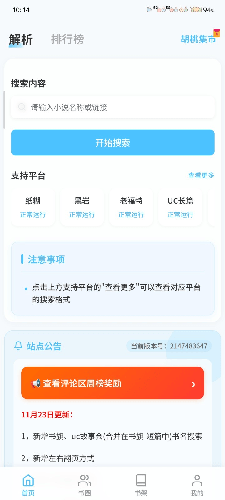 1、在胡桃爱读书软件首页上方的解析框中输入想要搜索的文章或者链接。