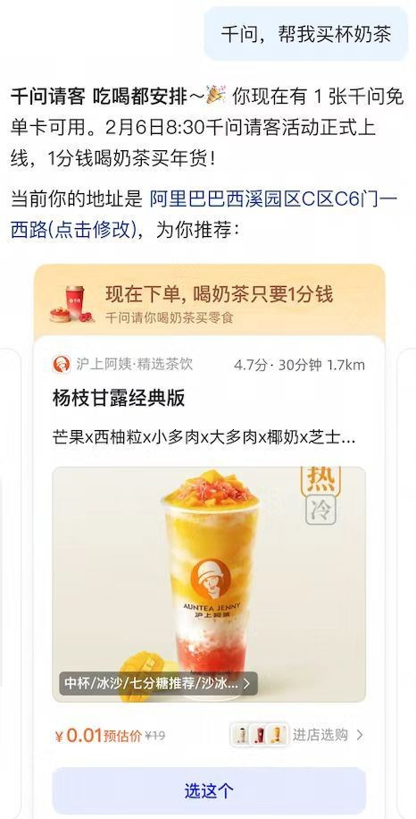 3、还能直接发送“千问,帮我买杯奶茶”来领取