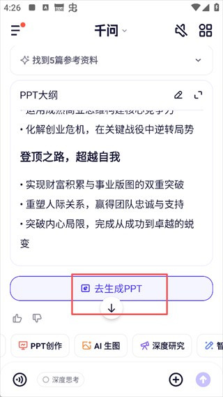 3、输出完PPT大纲之后,点击【去生成PPT】。