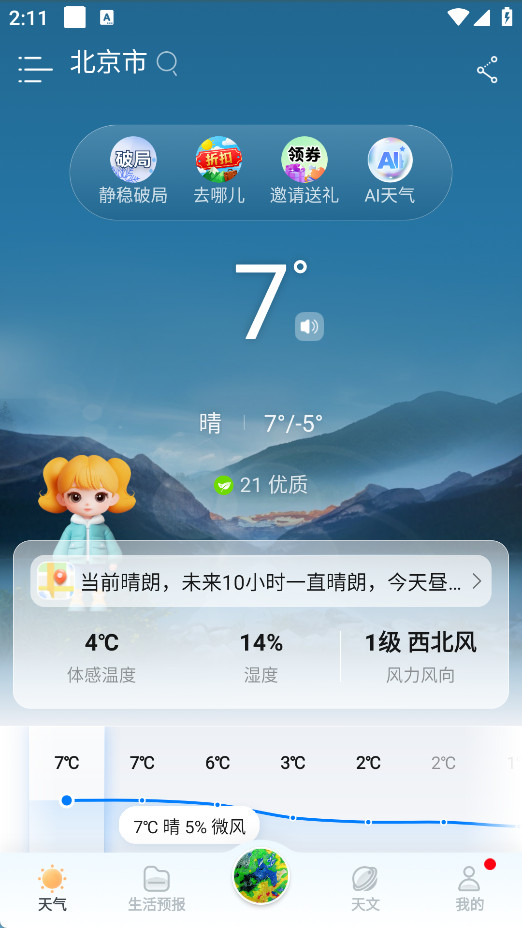 显示当前温度、体感、湿度等实况,还有小时级气温趋势,直观掌握实时天气。