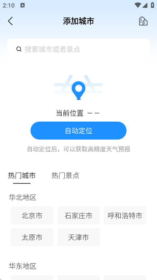 最美天气手机版可搜索、自动定位城市,也能直接选热门城市,快速绑定目标城市获取天气。