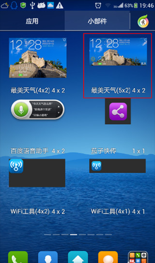3、如果你安装后还没有选小部件,那可以试试,在小部件中查找最美天气(5*2)4*2的部件,然后按着将其拖进主桌面就可以了。当然它还有多个部件可以选择,你都可以试试,看看习惯哪种设置。我是喜欢这种时间大大的。