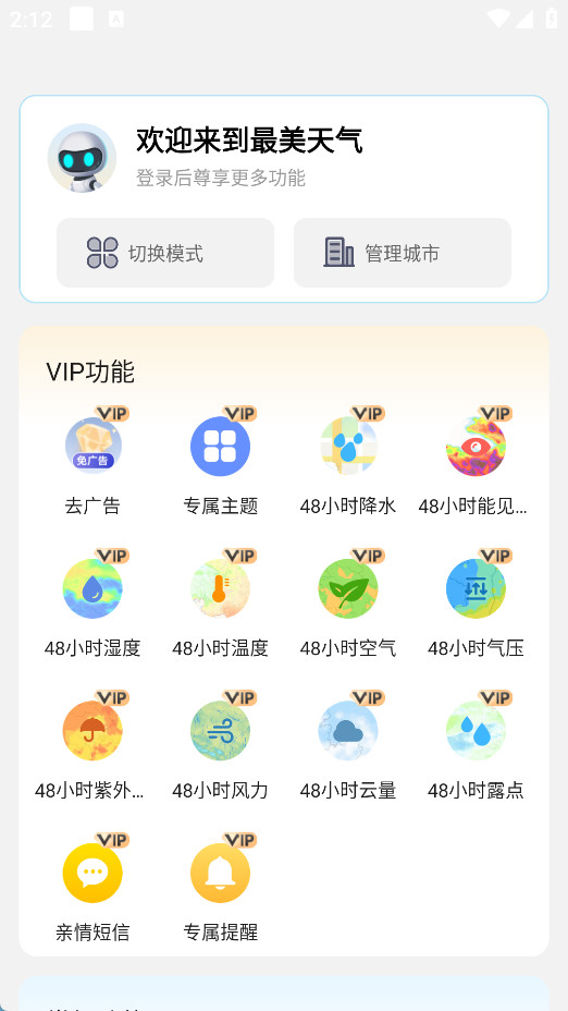 可切换模式、管理城市,还有 VIP 功能(免广告、专属主题等)。