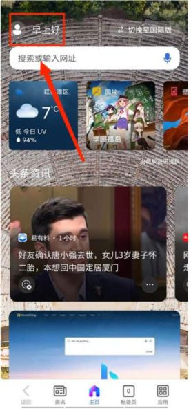 1、下载好必应bing后,点击进入,在主页中选择左上角的图标进入个人主页。