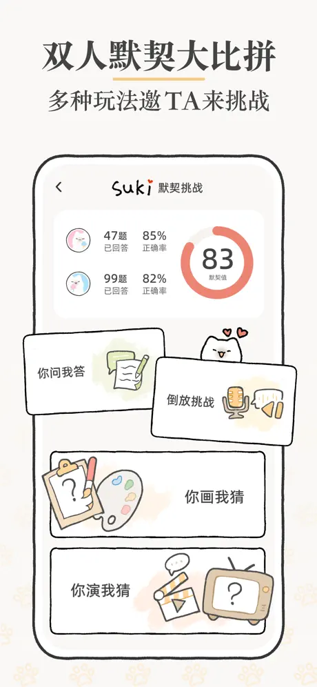 1、丰富玩法:suki提供多种互动玩法,帮助情侣轻松拉近彼此的距离。