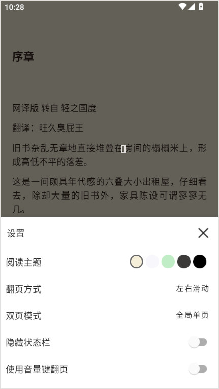 4、点击手机屏幕,并点击下方设置,可以设置阅读主题、翻页方式等。