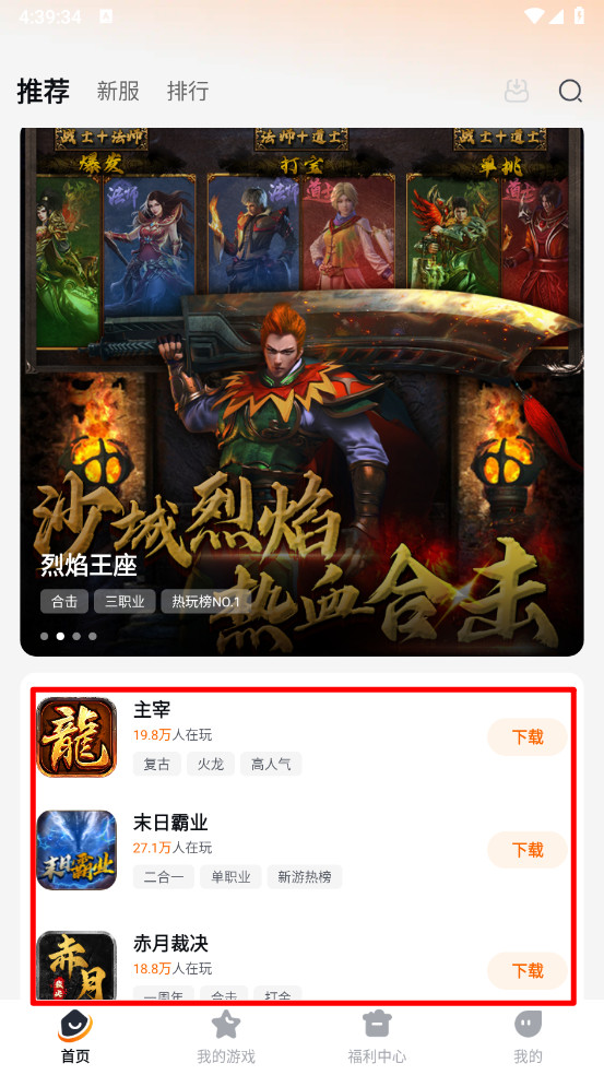 2、选择游戏并下载:首页游戏列表分类清晰,任选一款(如“烈焰王座”),点击下载等待进度条完成;
