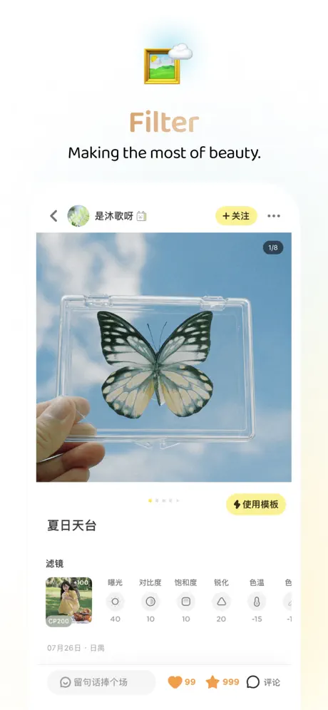 黄油相机开放的社区,好图不断,不用再愁没有修图灵感。开源的模板,「Ding」一下即可立即套用,为照片增色。更可以收藏模板随时使用。