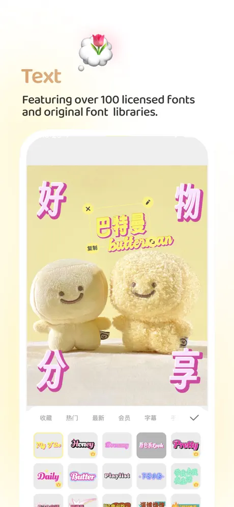 原创字体“黄油溏心体”、“黄油拾叁体”,只在黄油。百余款正版授权字体,从可爱到简约,涵盖中文、英文、日文、韩文。