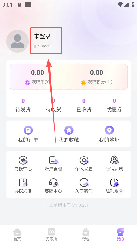 1、打开嘿鸭吖潮玩软件后,点击底部 “我的” 选项,进入个人中心页面。