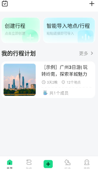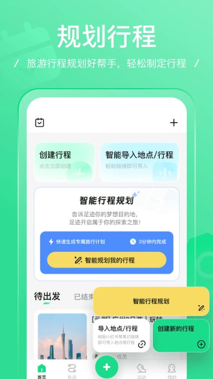 1、打开足迹路线图,首页提供【创建行程、导入地点/行程、智能制定我的行程】等功能,还能查看征战进行的目标。
