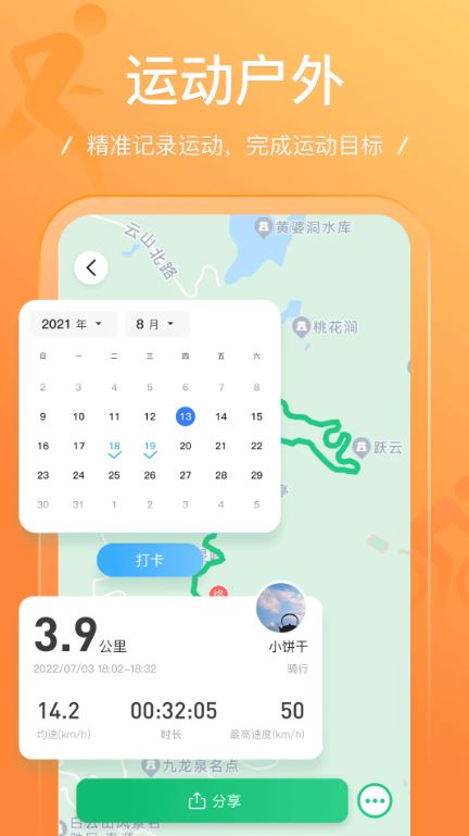 高精度记录户外运动轨迹,设置运动目标,每天打卡运动情况。