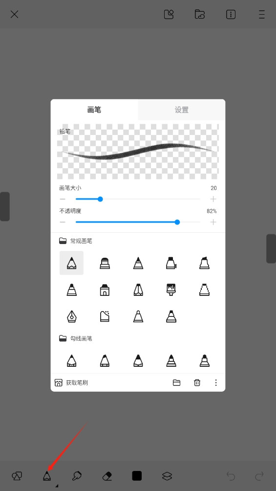 4、而下方的工具栏中,依次是形状、画笔、橡皮擦、调色板等这些绘画过程中最常用的工具,如下图所示,点击画笔就可以选择画笔类型,设置画笔大小。