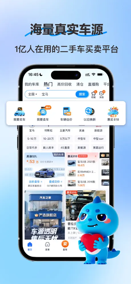 二手车之家交易市场官方正版手机版是个二手车交易与信息服务平台软件,把二手车买成放心车,把旧车卖出好价钱。二手车之家app用数据、审核和透明机制,拉近买卖双方的距离。平台聚合全国数百万条二手车源,按品牌、价格、里程、车龄、排放标准多维度筛选。二手车之家交易市场的每一个车的市场报价走势、同年份保值率、常见故障点、维修成本预估——数据来自汽车之家多年积累的车型库和真实成交记录。