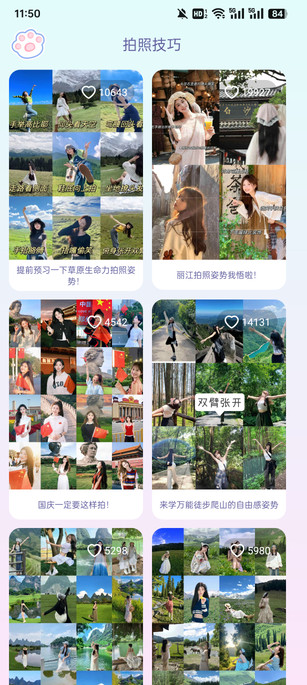 3、而且这里还有各种拍照姿势教学,让你再也不用担心没姿势拍照了。
