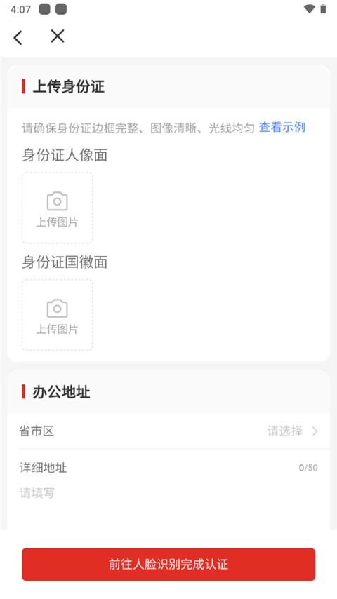 4、上传自己的身份证正反面,输入办公详细地址,点击前往人脸识别认证。