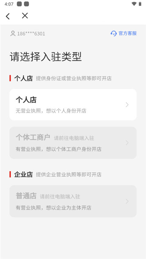 3、选择入驻类型,个人店或企业店;。