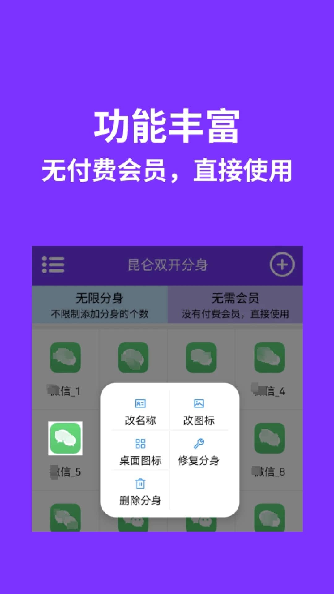 2、个性化管理:支持改名称、改图标,让不同账号一眼区分;分身列表更整齐,管理更省心。