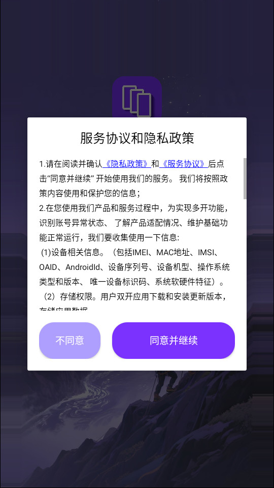 1、打开昆仑双开分身软件同意软件的协议规定;