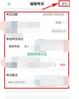 3、教练端进入编辑考试,填日期、学员等信息,点击保存,完成考试安排设置。