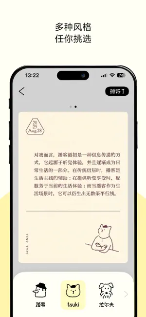 排版小动物tinytype官方正版手机版是个专注于文字记录与美化排版的创意软件。排版小动物的特别之处在于,应用中住着一群风格各异、性格鲜明的可爱小动物,可以将排版小动物用户记录的心情、日常生活、读书摘抄或随笔感悟,一键生成精美卡片。排版小动物内提供多种主题风格的小动物形象,例如日系风格的小猫 Tsuki、热爱旅行的路易、充满千禧年气息的小象亮亮等。