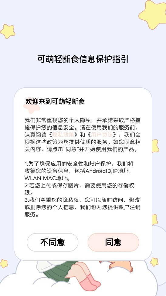 1、启动可萌轻断食后在隐私政策与用户协议界面点击同意,进入应用。