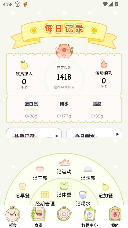 3、食谱页面可详细记录每日饮食情况,同时自动估算饮食热量,把控摄入。