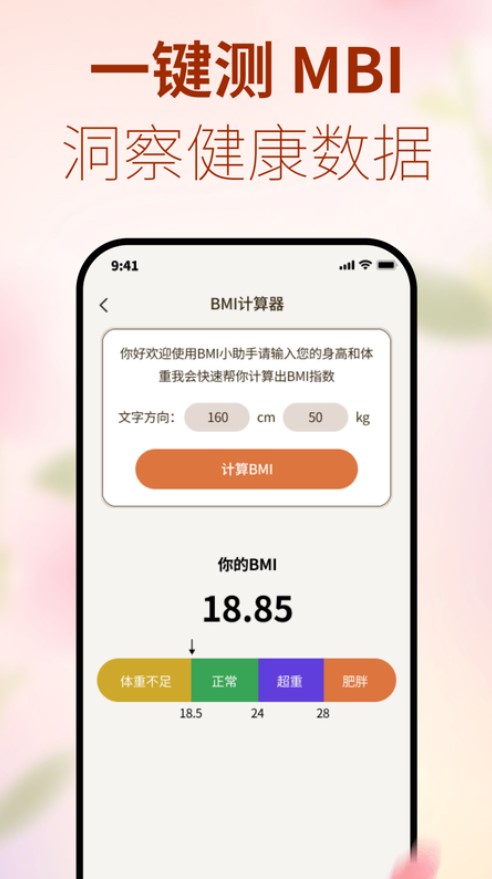 2、强大的BMI计算器功能,输入对应的数据就能快速计算出结果。