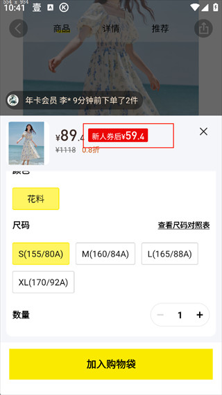 4、这边可以看到打了几折的,选择尺码点击加入购物袋
