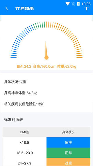 2、标准体重计算,根据身高体重,自动计算标准的体重参考值,方便决策减肥还是增重;