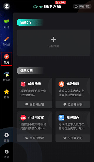 3、应用界面,用户可以使用编程助手、爆款标题、周报润色等应用,也能自己添加其他应用使用