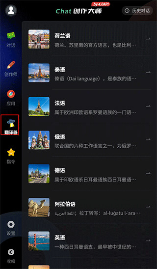4、在翻译器界面,可以用帮助用户翻译荷兰语、泰语、法语、俄语、德语、阿拉伯语、英语、日语等多种语言
