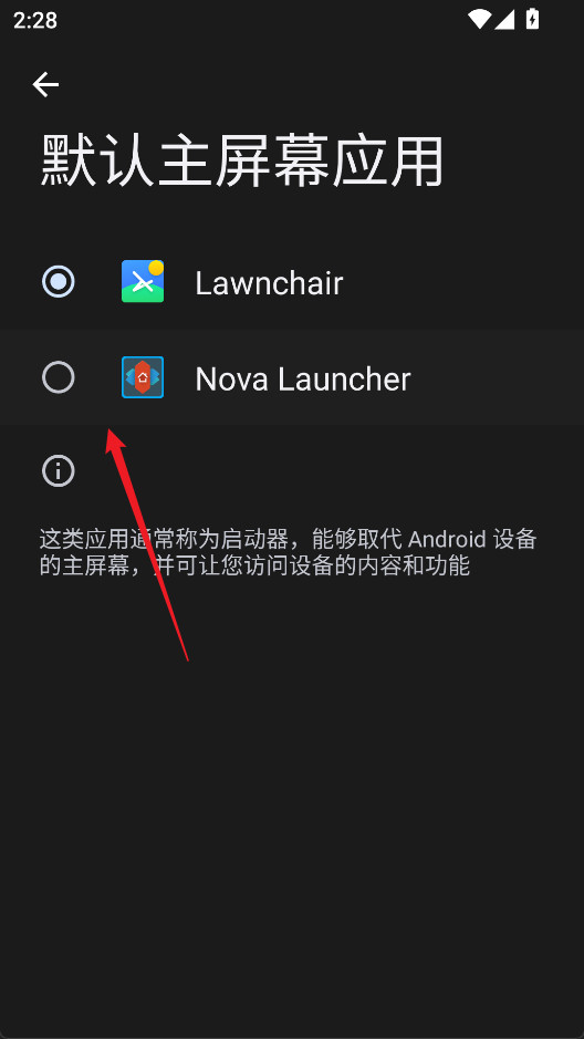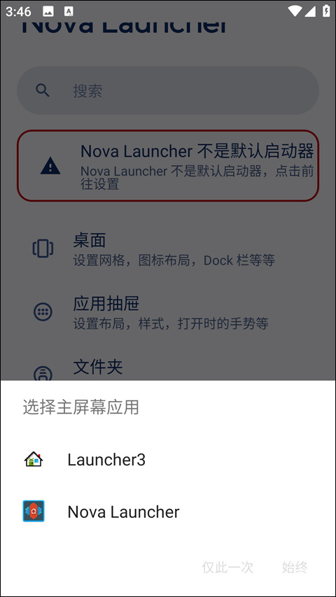 3、在弹出的列表中选择Nova Launcher,确认后即可生效。