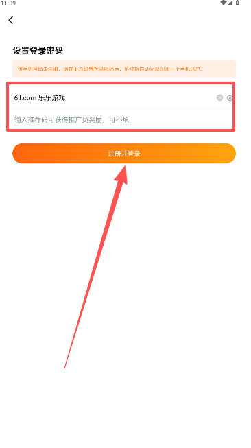 3、设置并输入账号登录密码,点击注册并登录,如果有推荐码可填入其中,在注册后额外获得用户奖励。