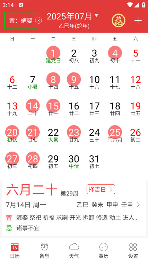 4、页面中标红的日期即是“宜:嫁娶”的黄道吉日;