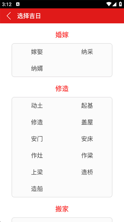 3、往下滑动还有搬家、出行、安葬以及开工等多个分类;