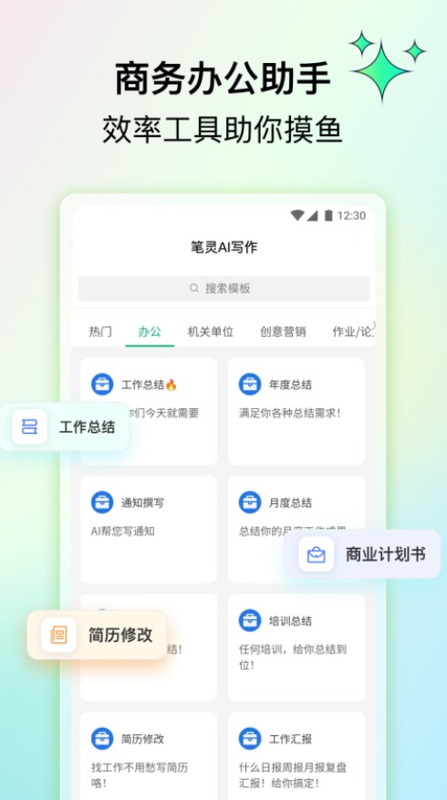 2、例如:选择“办公”,然后就可以获取对应的写作模板;