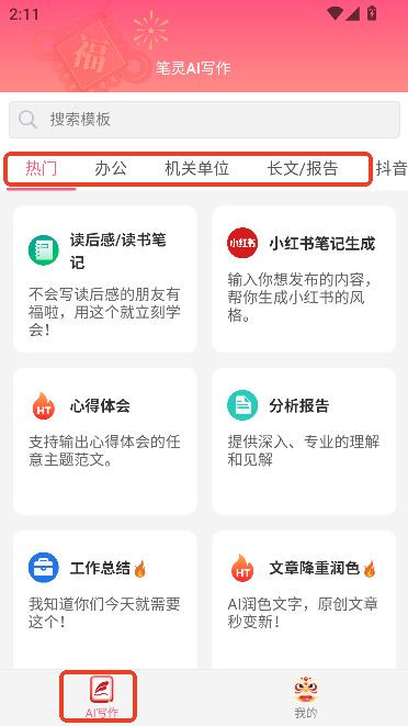 1.笔灵AI首页提供丰富的分类创作功能。