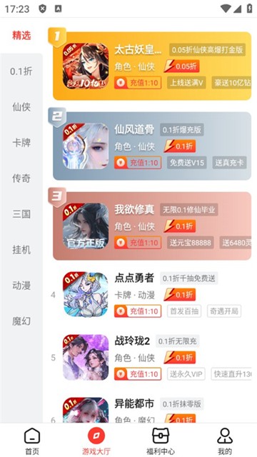 1、零点手游平台提供海量手游,包含了仙侠、卡牌、传奇等多种类型的资源。