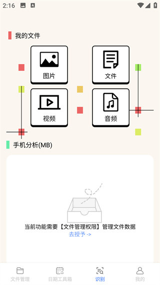 3、点击下方工具栏的识别,有我的文件和手机分析进行对文件的分类。
