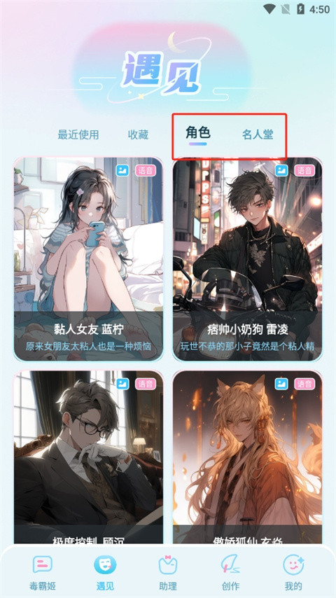 2、点击角色或者名人堂即可选择AI角色来进行聊天;