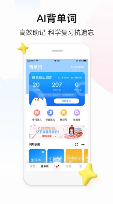 4、背单词:教、学、测、三位一体的背词模式,支持按同根词、考频、易错词、随机乱序等多种背词顺序,重点单词优先背。