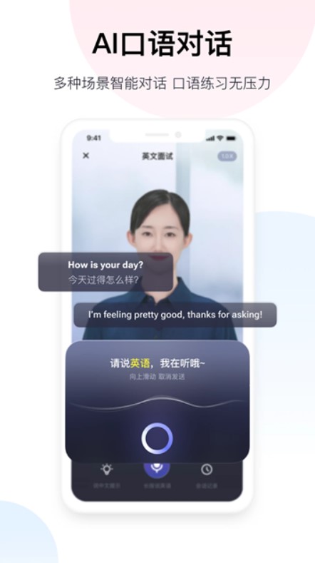 3、语音/对话翻译:实时语音翻译,支持中、英、日等21种热门语言的语音输入,更有英文口语打分纠音,助力口语提升。