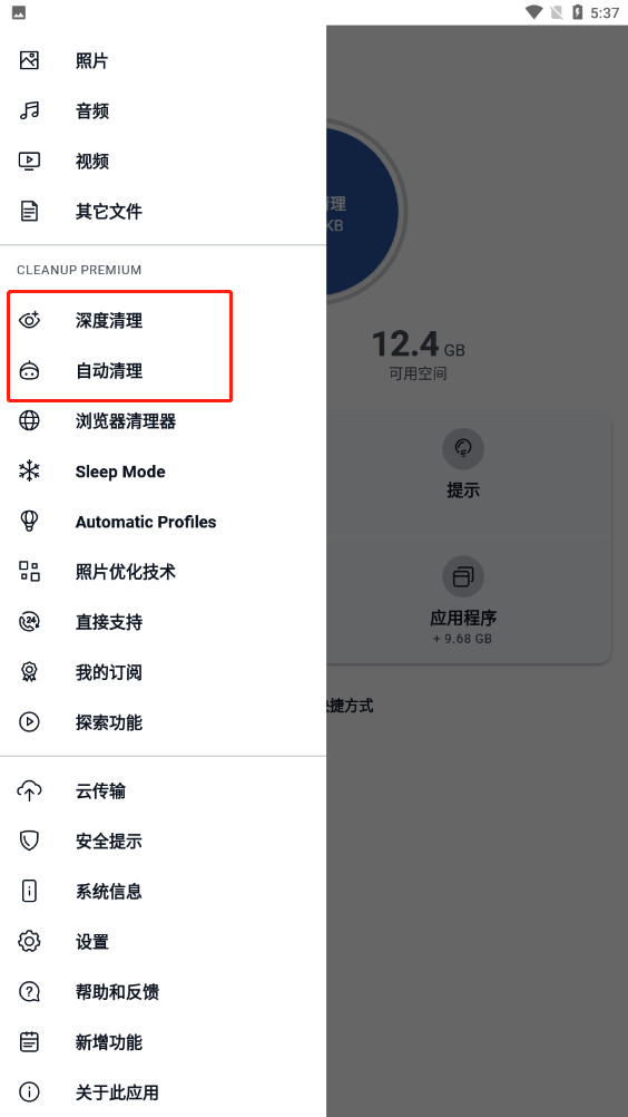 4、用户还可以深度或者自动清理手机,首先我们点击首页左上角的三条横线,然后点击深度或者自动清理就可以;