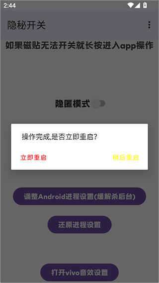 隐秘开关iQOOapp最新版是个手机游戏应用程序,它如同手机的“隐藏模式”启动器,一键开启隐藏功能或极限模式,隐秘开关iQOO显著提升手机性能,流畅运行游戏。简洁干净的界面,隐秘开关iQOO没有恼人的广告,轻松设置,让您专注于游戏体验。隐秘开关app支持应用图标伪装、通知栏信息屏蔽及虚拟权限授权,还能帮助普通用户轻松管理后台进程、清理缓存。