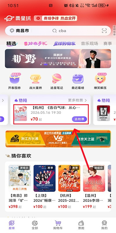 1、打开票星球app,进入首页,在此页面找到自己想要抢的门票并点击进入;