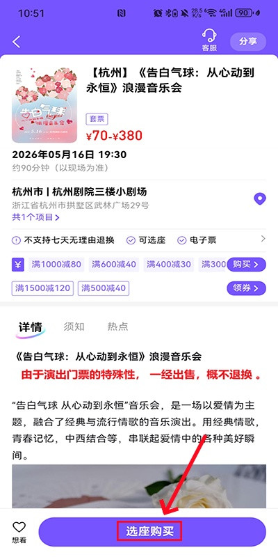 2、来到演出详情页面,再点击页面下方的“选座购买”按钮;